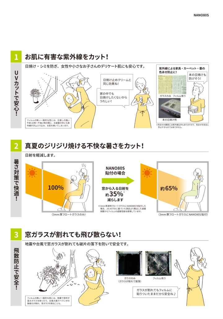 窓ガラスフィルムは遮熱性や断熱性、紫外線カットなどの効果だけでなく、防犯や防災にも最適です。